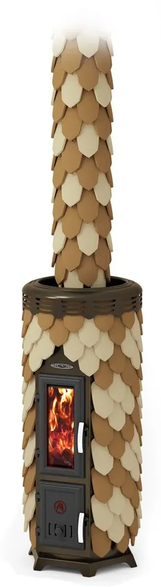 Она не лучит, «не пышет» жаром, а дарит комфортное мягкое равномерное тепло, свойственное кирпичным печам. Облицовка терракотовыми изразцами металлического кожуха печи способствует её более длительному остыванию. Такая керамическая «шуба» отлично аккумулирует тепло, постепенно отдавая его окружающей среде.